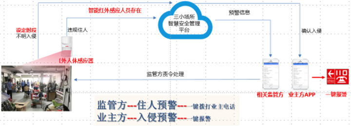 红外人体存在感应器在设定的时间内(可自由设置)实时感知三小场所夜间人员滞留情况,当探测到人员存在时,立即预警,推送报警信息至相关监管方/业主方APP上。
